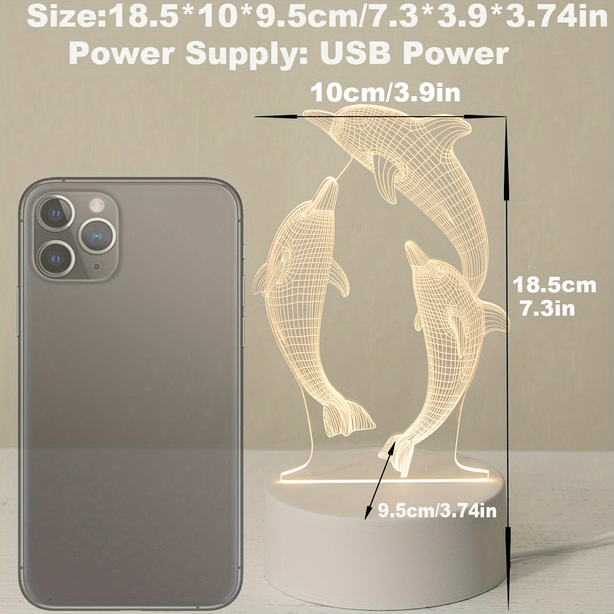 Bringen Sie die Magie des Ozeans mit dem 3D-Delfin-USB-Nachtlicht in Ihr Zuhause. Sein leuchtendes Delfin-Design schafft eine beruhigende Atmosphäre – perfekt für Schlafzimmer, Wohnzimmer oder als einzigartiges Geschenk. Die Stromversorgung über USB ist ein stilvoller und energieeffizienter Akzent für jeden Raum.